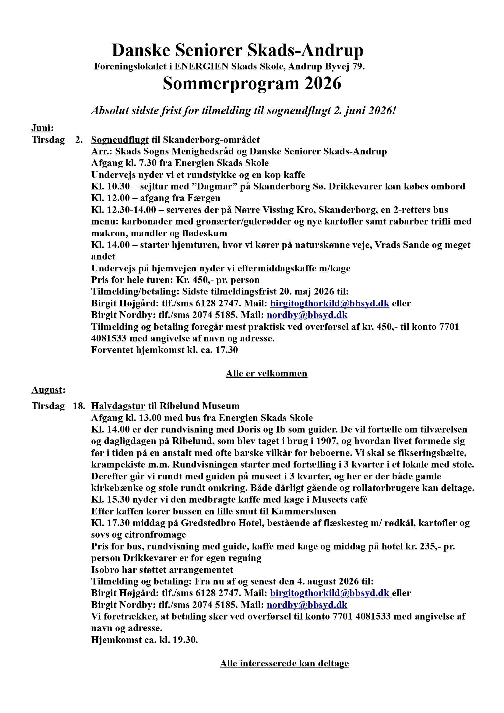 15. april 2026 In Danske Seniorer Skads-Andrup, Nyheder Danske Seniorer Skads-Andrup – Sommerprogram 2026 Se som PDF Link til Sogneudflugt til Skanderborg-området Link til Halvdagstur til Ribelund Museum